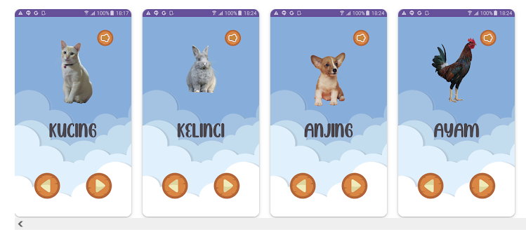 Aplikasi ini membahas nama-nama hewan, gambar hewan beserta bunyi dari hewan tersebut. Berikut ini beberapa screenshot dari aplikasi :