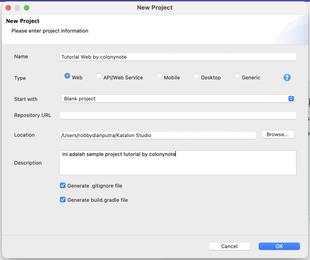 Kemudian kita tinggal pilih type project saja, untuk permulaan saya menyarankan teman-teman untuk menggunakan Type:Web karena lebih mudah untuk dipelajari.